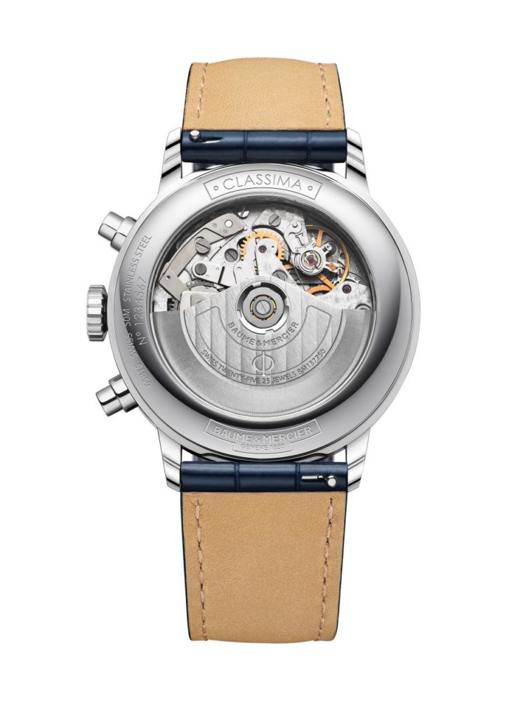 Display: Sun-satin blue dial, Roman numerals, Rhodium-plated hands, minute markers, date display at 3’o clock.