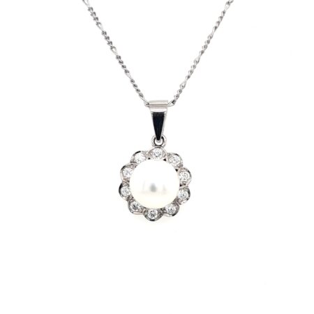 A platinum akoya cultured pearl and diamond cluster pendant on a 16" platinum figaro pattern chain.