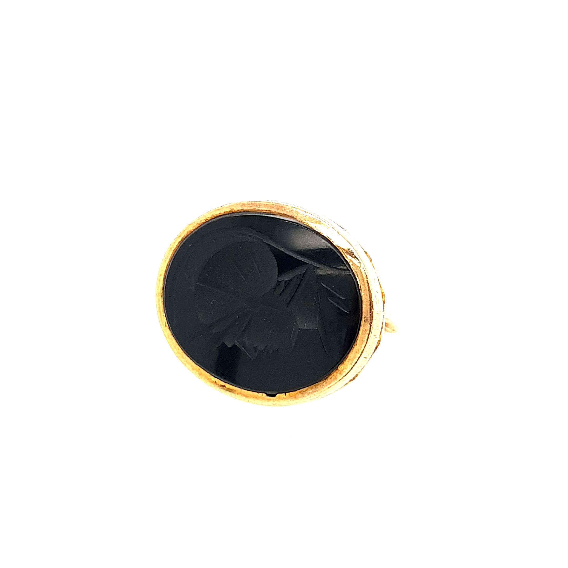 A 9ct Yellow Gold Lion Fob set with an oval cut onyx carved with a soldier.