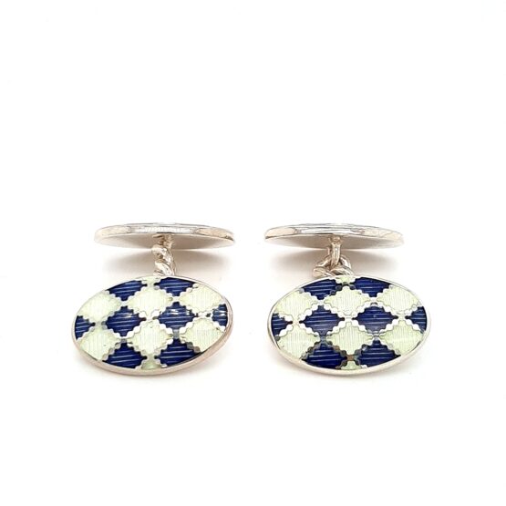 A pair of Silver cufflinks with blue and white checkered Enamel and chain link fitting.