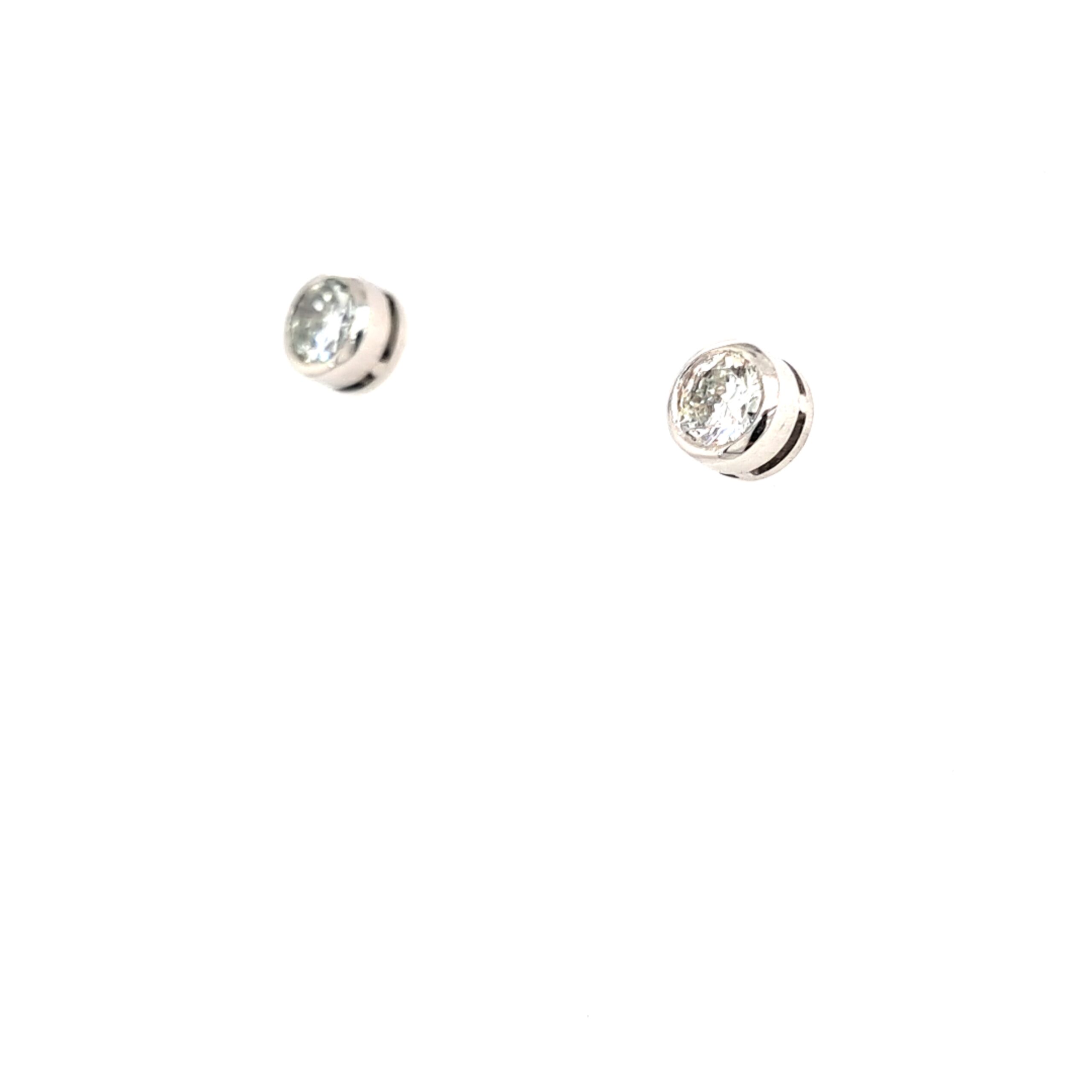 A pair of platinum rub over set round diamond stud earrings on post and scroll fittings.